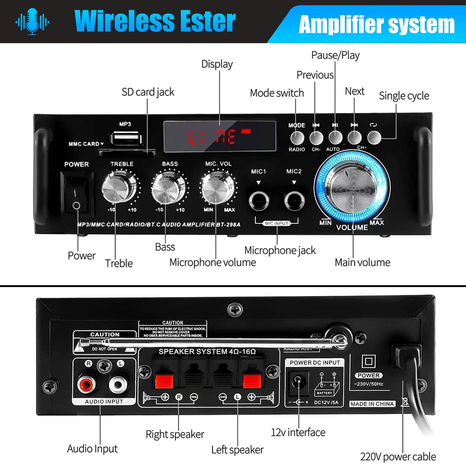 - 【Amplificador con Sonido HIFI Auténtico】Estéreo, con volumen principal, un ajuste de agudos y otro de bajos, regulables analógicamente para controlar el amplificador. Reproduce la música de todo el mundo de una forma fidedigna, brindándole un auténtico sonido HIFI, "Nuestro BT-298A emplea un chip 7737 de alta gama importado, Fortalece la estabilidad y precisión de la señal de transmisión de audio. A diferencia de otras imitaciones en el mercado, Elija la marca Etlephe para comprar.