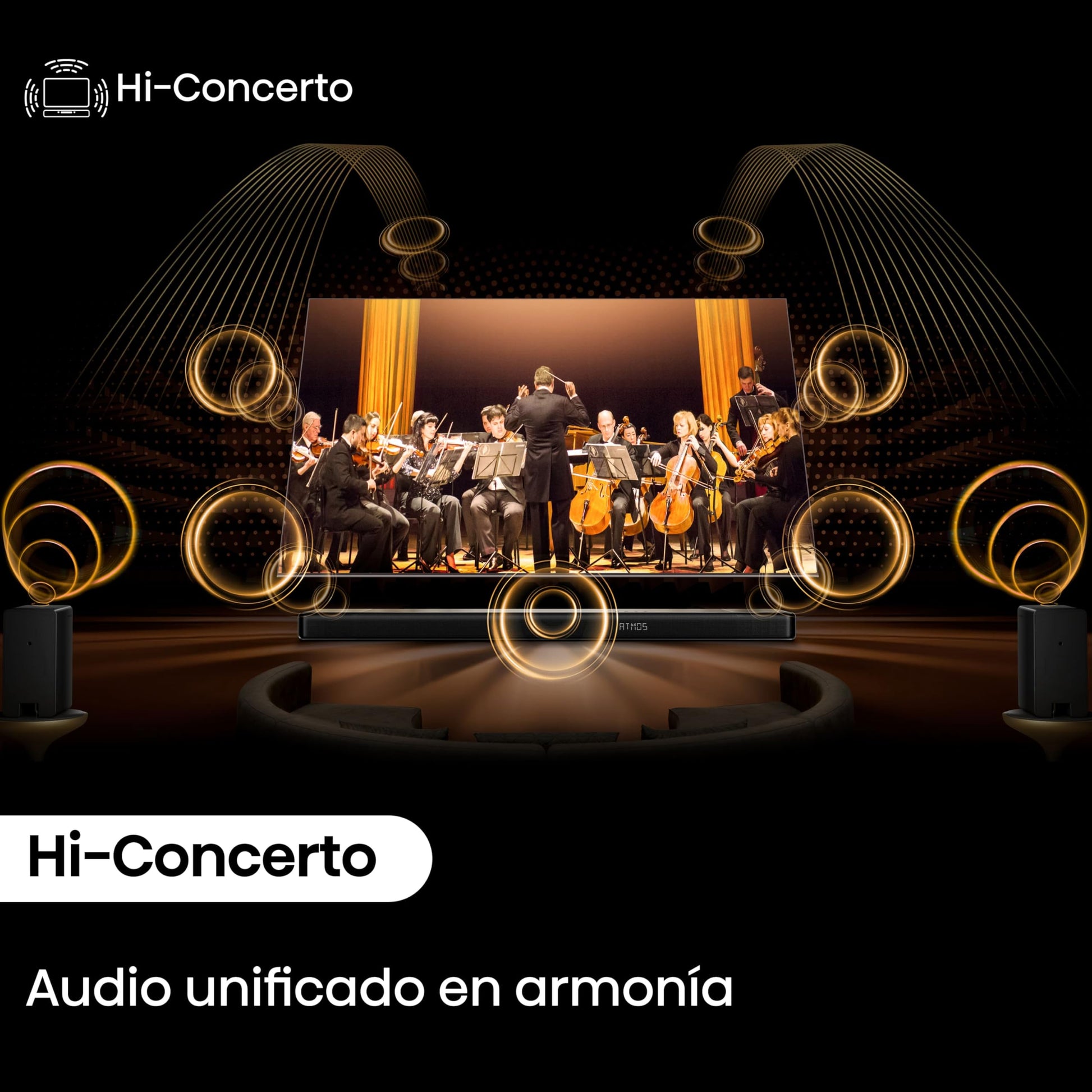 - Hi-Concerto: Armonía sonora unificada. Déjate envolver por el sonido surround combinado de tu televisor y barra de sonido. Con la tecnología Hi-Concerto, ambos dispositivos trabajan en perfecta sintonía para crear un auténtico cine en casa, sin complicaciones ni cables adicionales.